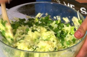Aynı kabın içine yumurtaları kırın, dereotu, maydanoz ve yeşil soğanı da ince ince doğrayıp ekleyerek karıştırın.
