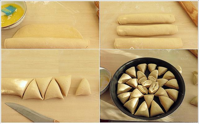 - Hazırladığımız ruloyu 2-3 cm genişliğinde olacak üçgen şekilleri vererek keselim.